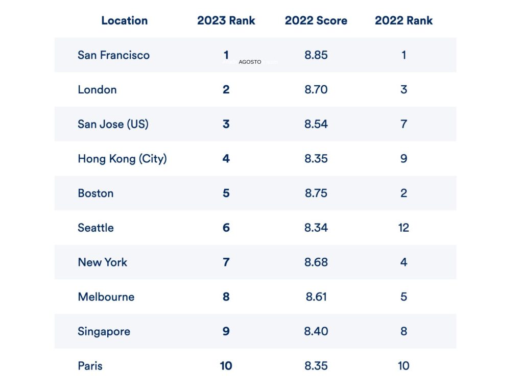Anteriormente, Londres había caído del primer al tercer lugar en el Índice 2023. Este año ha subido al segundo lugar, detrás de San Francisco debido a un crecimiento más lento de los ingresos de los hogares. San Francisco también mantuvo su ecosistema dominante de capital de riesgo y de empresas emergentes, impulsado por una nueva ola de inversión en IA.