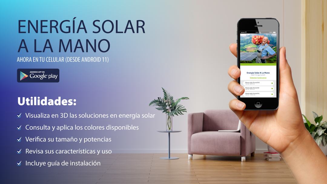 En Ambiente Soluciones se ha desarrollado una aplicación para dispositivos móviles Android que permite interactuar y conocer de forma practica el funcionamiento de las soluciones en energía solar que están disponibles para usted en los puntos de venta, descargue la app para entender el funcionamiento y conexión de los diferentes sistemas de energía solar, acceder a las líneas de atención o comprar online para su hogar, trabajo o propiedad.